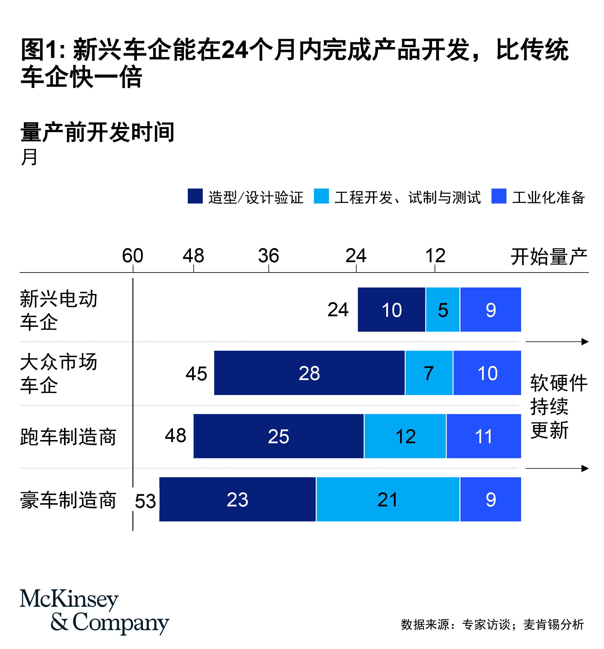 这些专注于新能源的中国新兴车企,将新车型从概念验证到产品上市的周期压缩至约24个月¹,比传统车企的40~50个月快了一倍(图1)。快速迭代让它们能够抢先推出新技术与“首发功能”,实现产品差异化,这也为全球传统车企提供了重要启示。