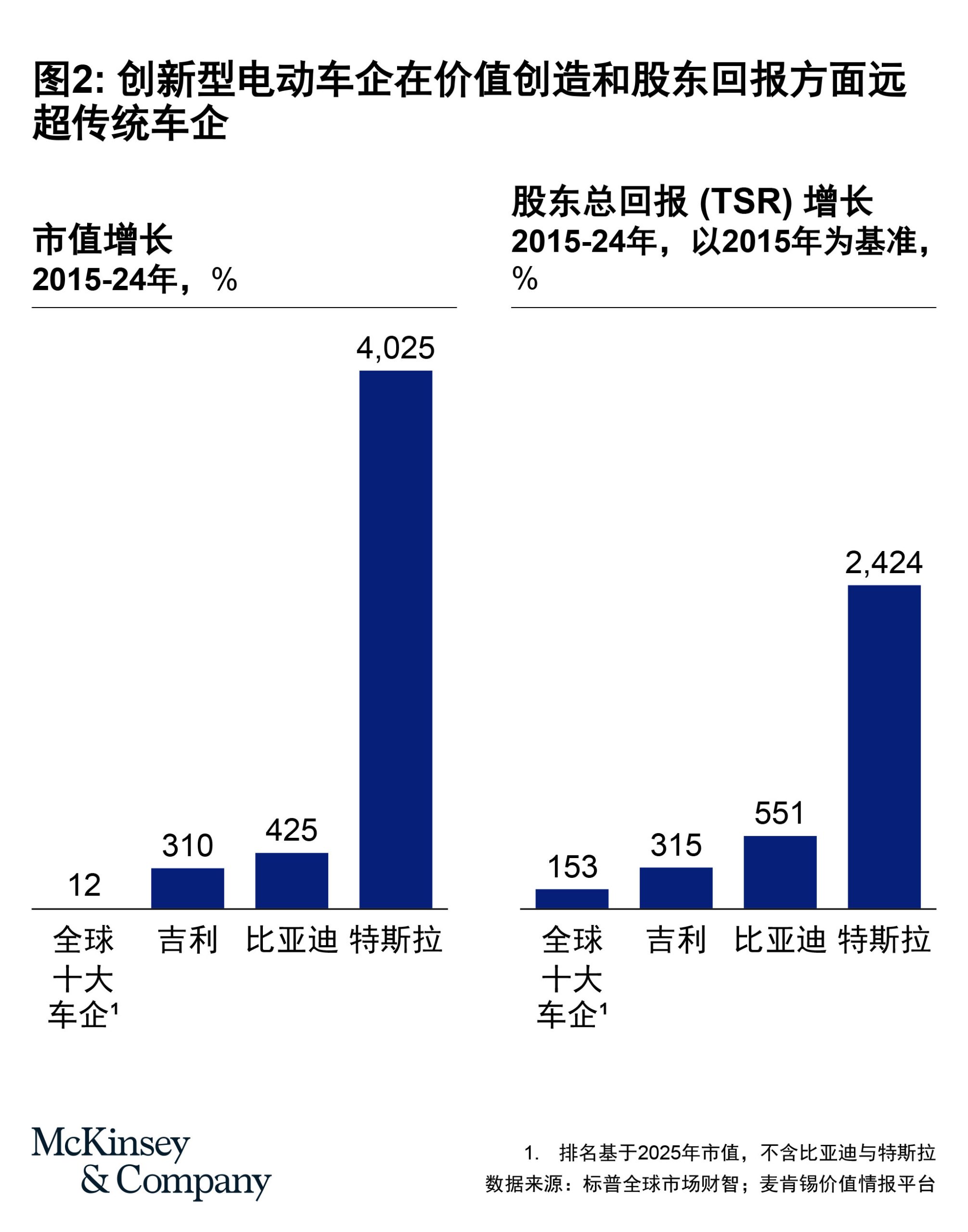中国车企正加速走向全球,与传统品牌同台竞技。例如,比亚迪已在匈牙利、印度尼西亚和土耳其建设整车装配厂。与此同时,新兴车企也赢得了资本市场的高度关注:比亚迪、零跑、理想和赛力斯的新能源车产品线已实现盈利,而不少海外电动车企仍在为此挣扎。资本市场的选择已说明一切:过去十年,比亚迪、吉利,以及特斯拉等车企,市值均实现四倍以上增长;相比之下,除比亚迪与特斯拉之外的全球十大车企,市值几乎停滞不前(图2)。同一时期,比亚迪的总股东回报率(TSR)飙升超过550个百分点,而其他大型车企的平均涨幅仅为其三分之一,不到153个百分点。
