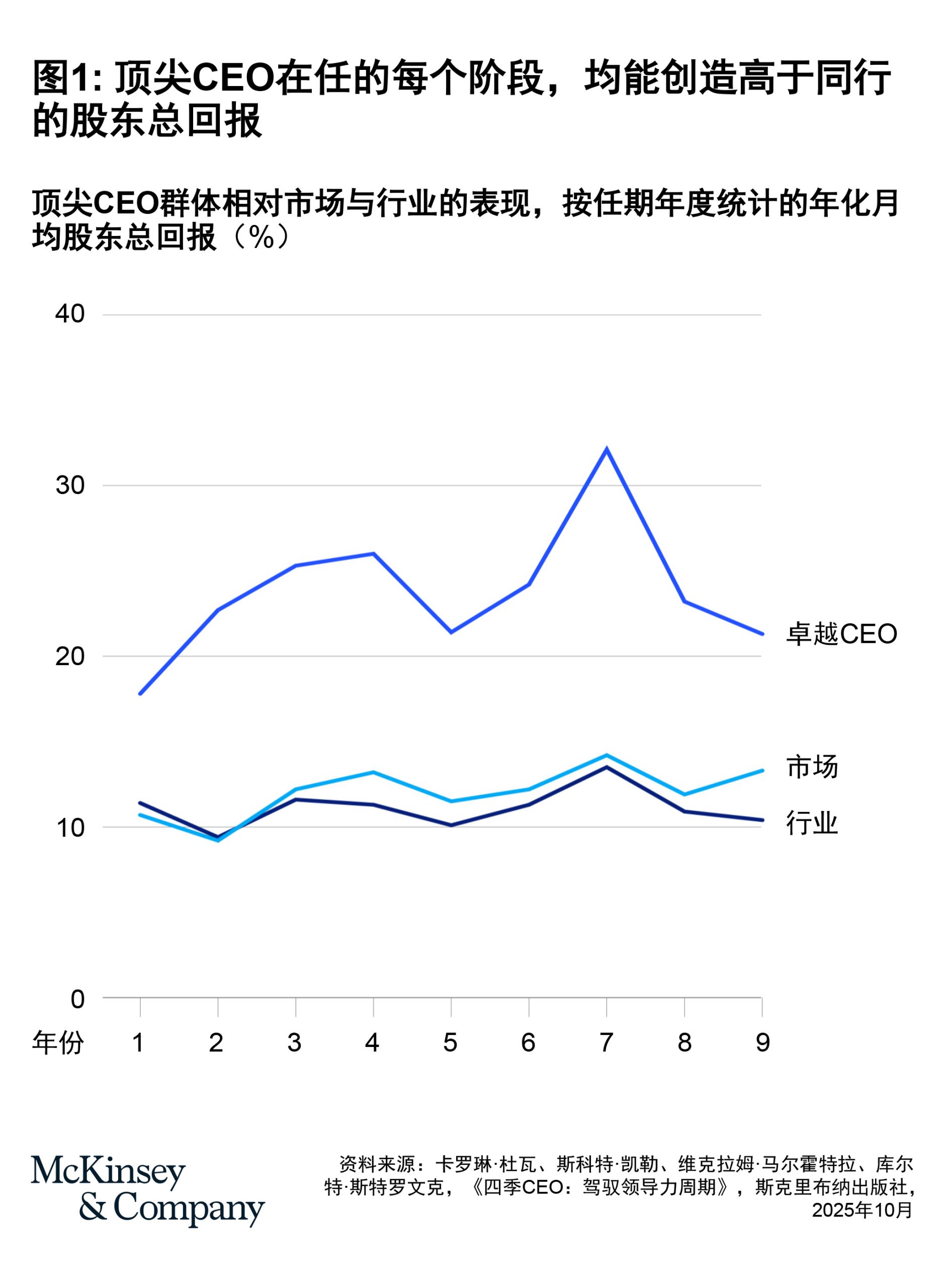 但我们真正关心的,并非单一时点的成绩,而是他们在不同阶段的轨迹表现:他们是强势开局后便止步不前?还是在经历“二年级低谷”后,于任期中段成功反转?抑或是前期稳扎稳打,直到任期尾声才迎来“曲棍球棒式”的爆发?图1显示的答案并非以上任何一种:卓越CEO在四个阶段中的表现,始终优于同行。