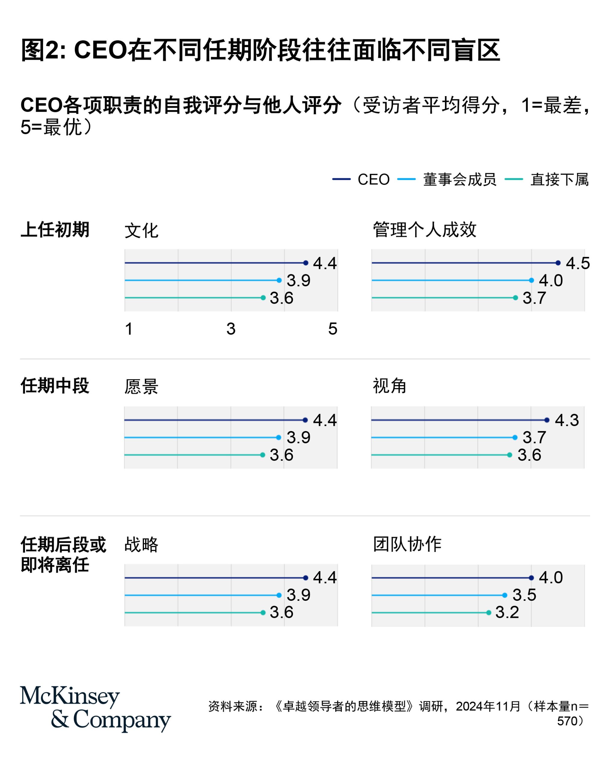 从整体结果看,CEO似乎正是这座小镇的“居民”:无论任期长短,他们对自身表现的评分,在100%的情况下都高于直接下属的评价,在80%的情况下高于董事会的评价。而那20%董事会评分高于CEO自评的情形,多发生在任职初期。原因并不复杂:董事会往往对自己选定的新CEO抱有高度期待,而此时的CEO仍在熟悉岗位,尚未完全建立起自信。