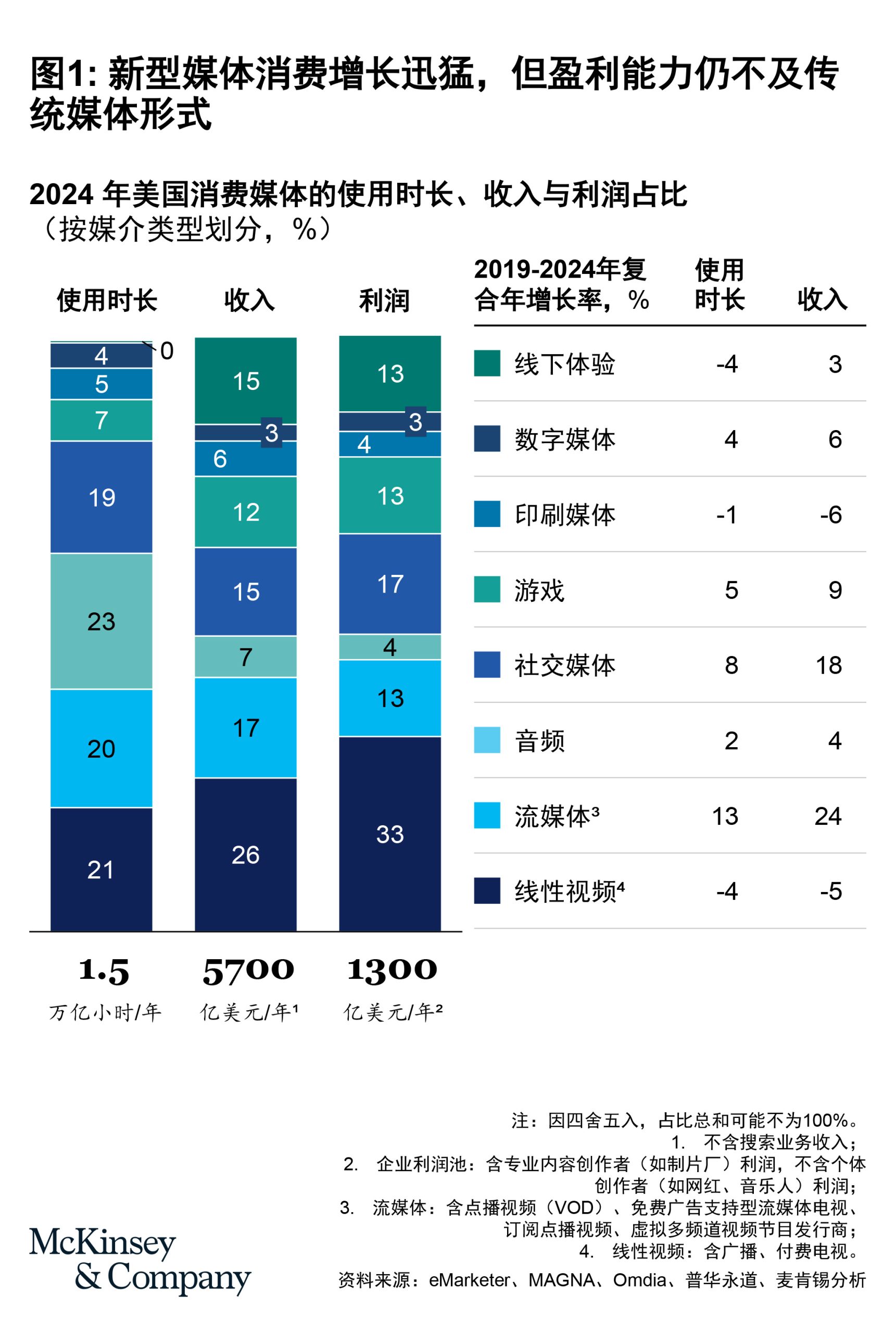 毫不意外,内容、平台与设备的爆发式增长,稀释了消费者的整体注意力,也让企业更难将不断变化的参与习惯有效转化为收入。近年来,经通胀调整后的媒体收入基本停滞。尽管社交媒体、视频流媒体与数字音频的消费时长持续攀升,但其带来的消费者支出与利润水平,仍难以比肩有线电视、传统纸质出版物、电影院及其他实体媒介。总体来看,数字媒体的收入和利润占比,往往低于其消费时长占比(图1)。