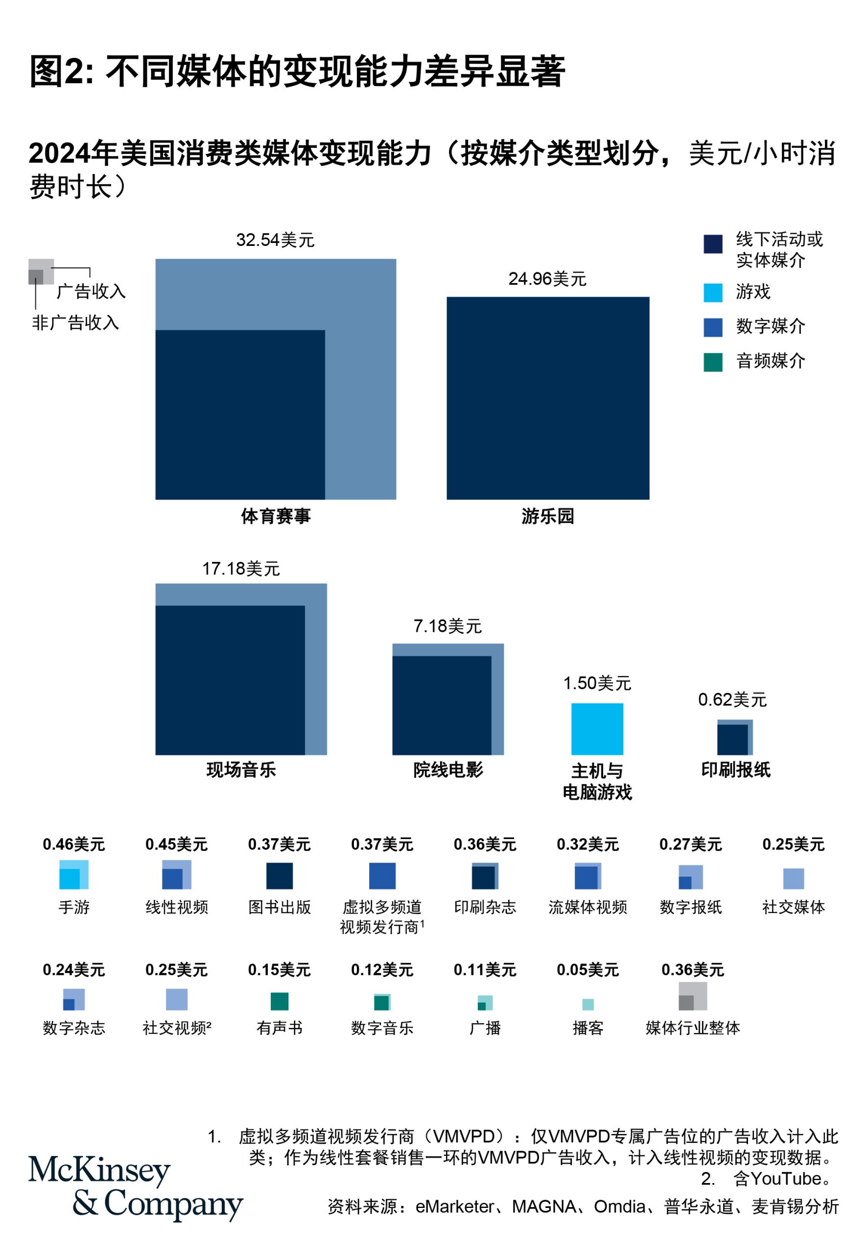 在我们分析的20种争夺消费者注意力的主流媒介中,单小时消费所能创造的价值差异悬殊。现场体育赛事的单小时价值高达33美元,其后依次是主题乐园(24美元)和现场音乐会(17美元);数字音乐(0.12美元)、广播(0.11美元)及播客(0.05美元)则处于价值谱系的低端(图2)。社交媒体与社交短视频,是当前变现增长最快的领域。预计在2024-2028年间,它们的每小时收入将分别以年均10%和7%的速度增长。但现阶段,它们在非现场媒介中仍处于中游水平,单小时消费收入约为0.25美元。相比之下,纸质报纸、杂志和书籍等传统媒体形态,尽管整体价值呈下行趋势,变现能力依然仅次于现场活动与游戏,远超对应的数字媒介。