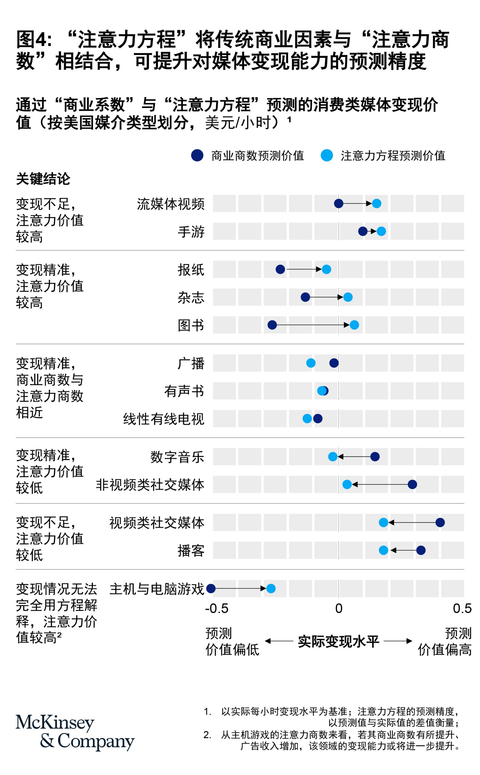 将AQ(注意力商数)纳入传统商业驱动因素之中,可以显著提升对单位小时变现能力的预测精度。同时,这一框架也为理解不同媒介为何在变现效率上存在差异,以及这些差异可能如何随时间演变,提供了更具解释力的视角(图4)。例如,当注意力方程为某一媒介(如视频流媒体)给出的理论变现水平高于其当前实际水平时,往往意味着该媒介仍处于“变现不足”状态,未来收入增速有望快于消费增速。