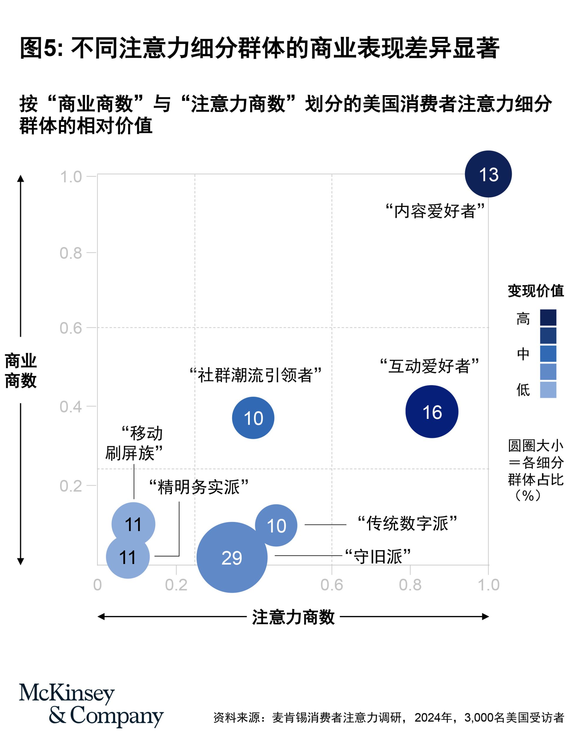 基于一项覆盖广泛、具有代表性的美国人群样本分析,我们共识别出7类消费群体。其中,约40%的消费者同时具备较高的注意力价值与商业价值,可细分为三类: