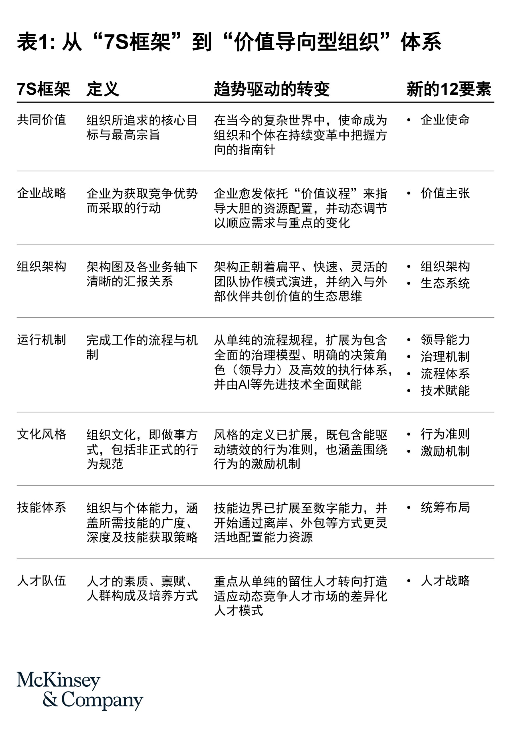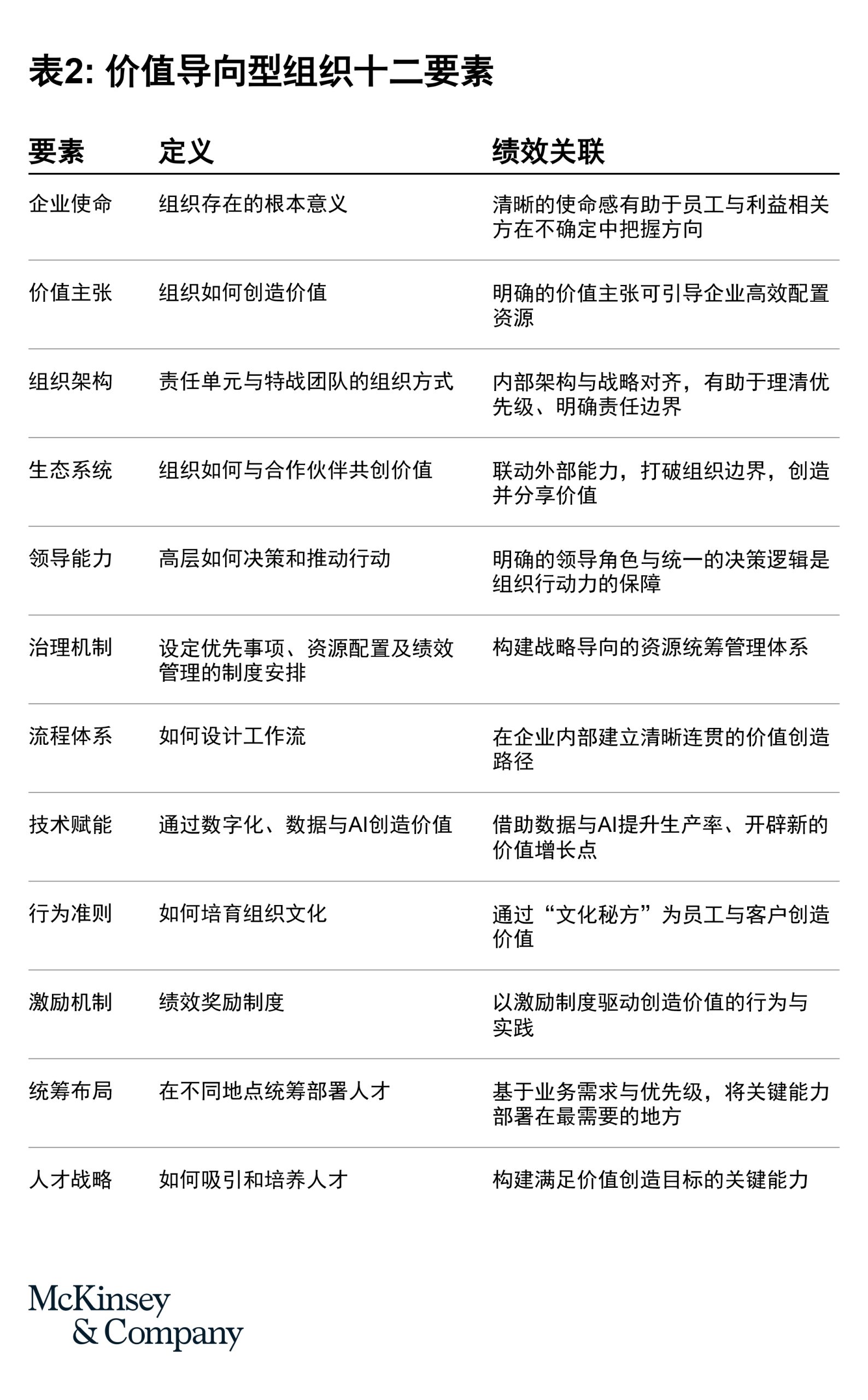 正因如此,我们决定更新有关运营模式设计的最佳实践2。综合学术研究、与数百位高管的深度访谈,以及麦肯锡在支持企业转型过程中的实战经验,我们提出了一套全新方法论:一个由12个核心要素构成的动态系统(涵盖企业使命、人才战略、领导能力、激励机制等),企业可根据所处环境与发展目标灵活配置。我们将其命名为“价值导向型组织”(Organize to Value)系统。