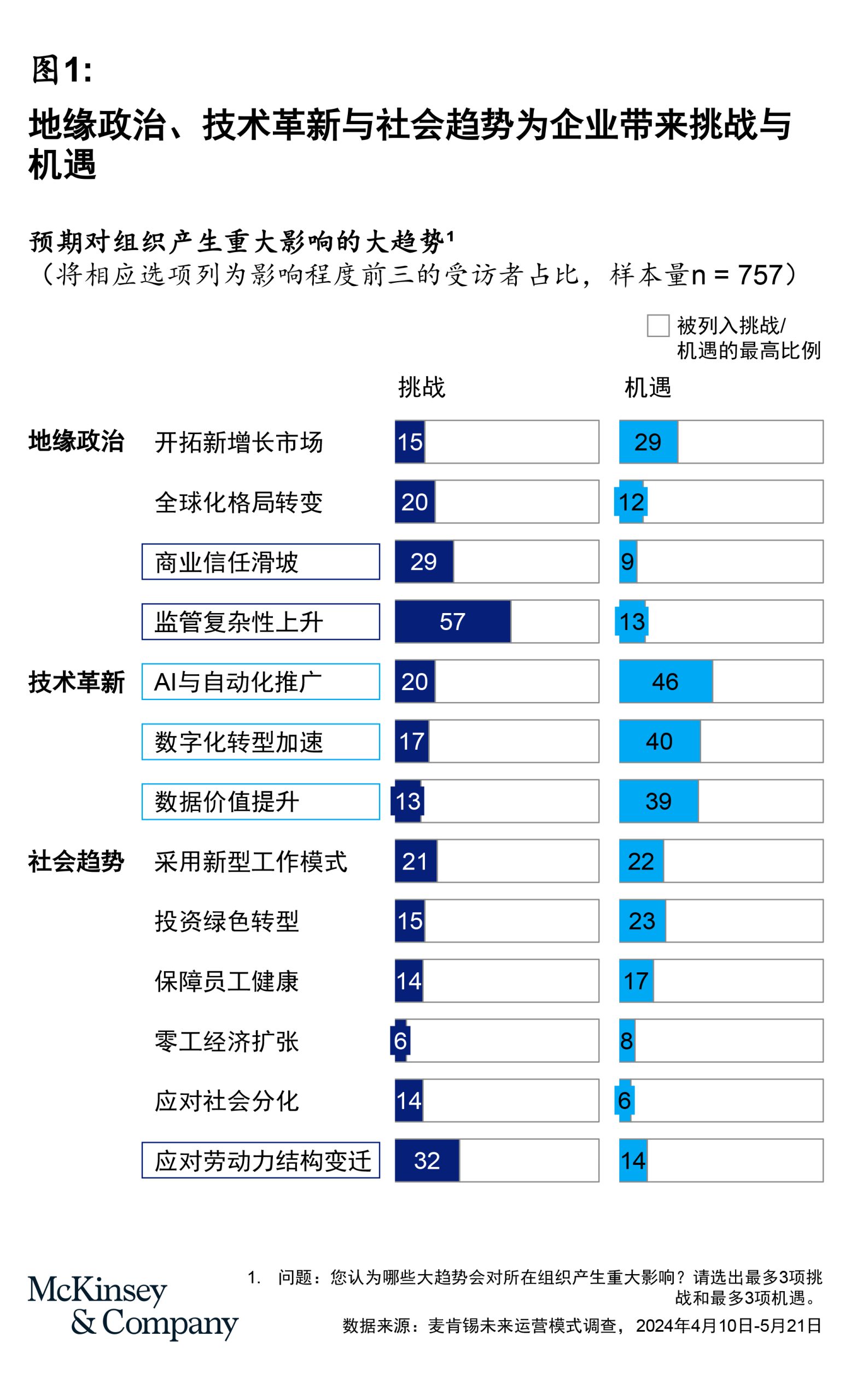 为此,我们邀请高管们评估各类发展趋势,并识别对其业务发展和组织架构影响最大的机遇与挑战。