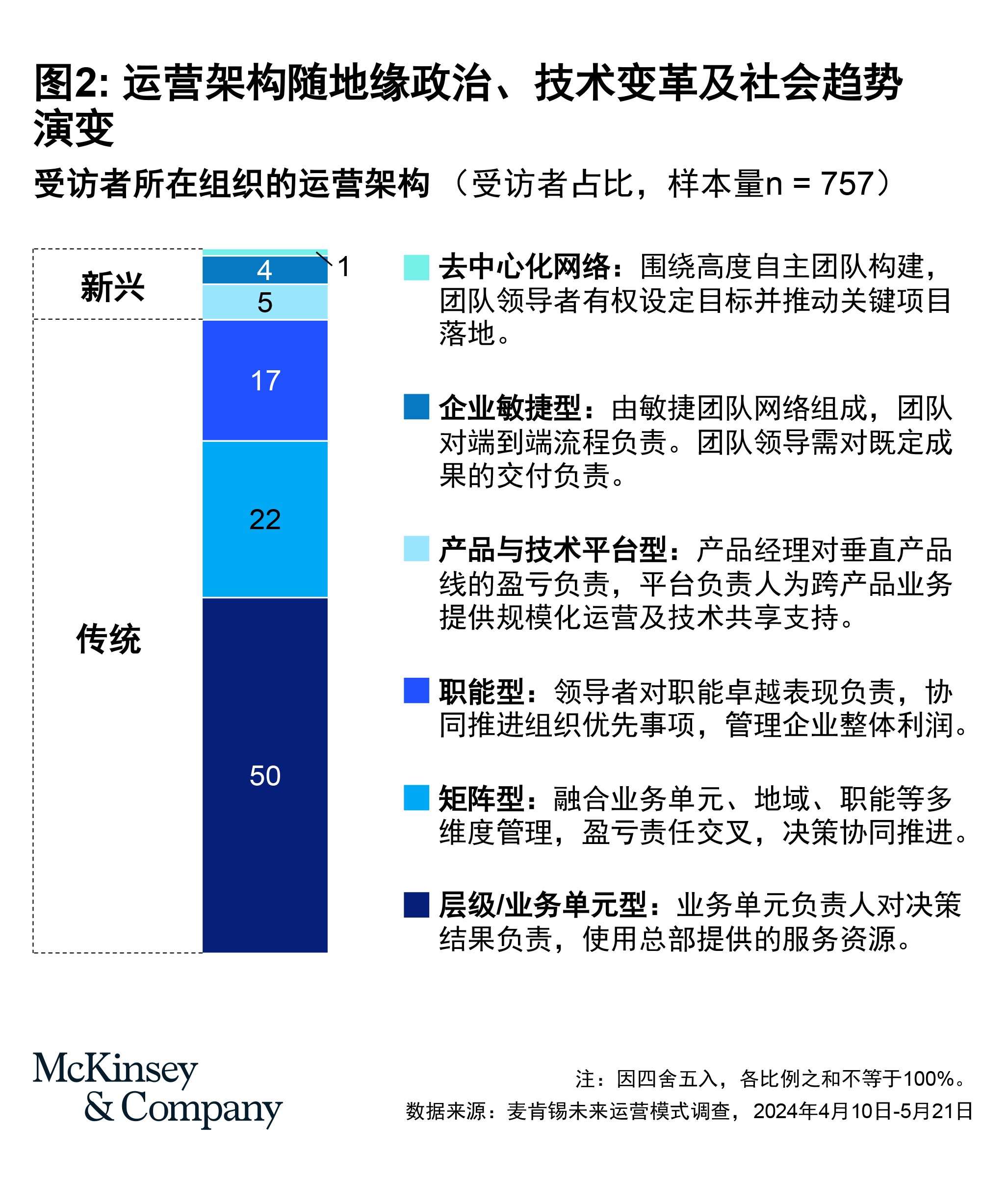 我们进一步请高管们从六种典型组织架构中选出最贴合自身企业现状的模型。结果显示,89%的企业仍主要采用传统层级体系,包括事业部/控股公司架构、矩阵式管理模式及职能型组织。同时,也有部分企业开始以三类新兴架构作为运营模式重构的核心抓手:产品平台模式、企业敏捷模式、去中心化网络模式(见图2)。