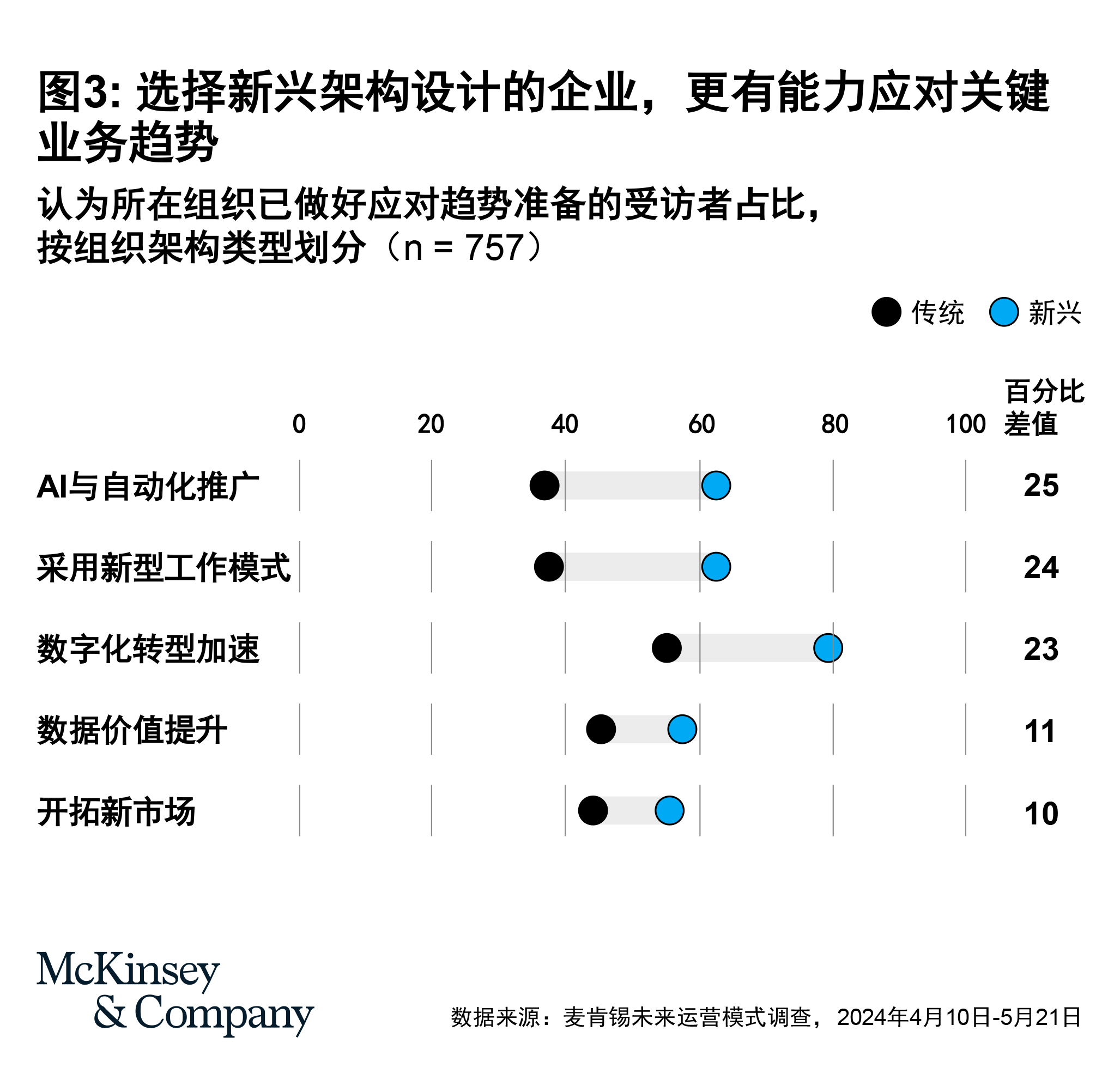 我们还邀请高管评估其组织应对关键趋势的准备度,这些趋势被他们视为当下最重要的机遇与挑战。研究结果再次印证:并不存在放之四海而皆准的“万能架构”,能够一劳永逸决定组织效能的高低。我们调研的6种结构中,每一种都能孕育出高绩效的企业。但值得注意的是,采用三种新兴架构的企业在面对核心趋势时展现出更强的应变力和前瞻性。它们通常在创新、技术和数据战略方面更加积极主动,也更能从容应对AI规模化与数字化转型所带来的冲击(见图3)。