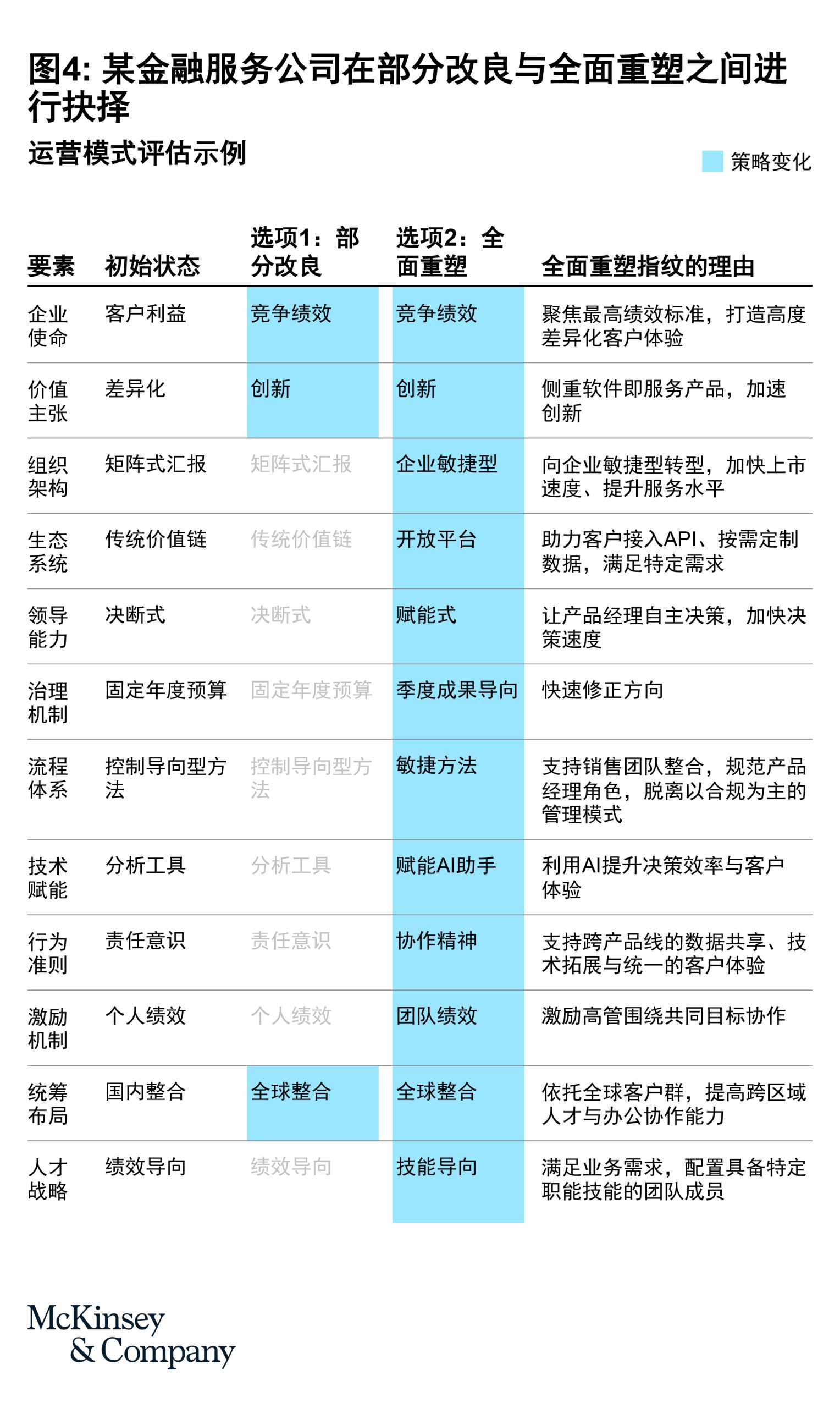 - 在有限改良与全面重构之间,企业应如何权衡?评估转型所需的变革幅度与预期收益,同时识别硬性与软性障碍,做好充分准备。