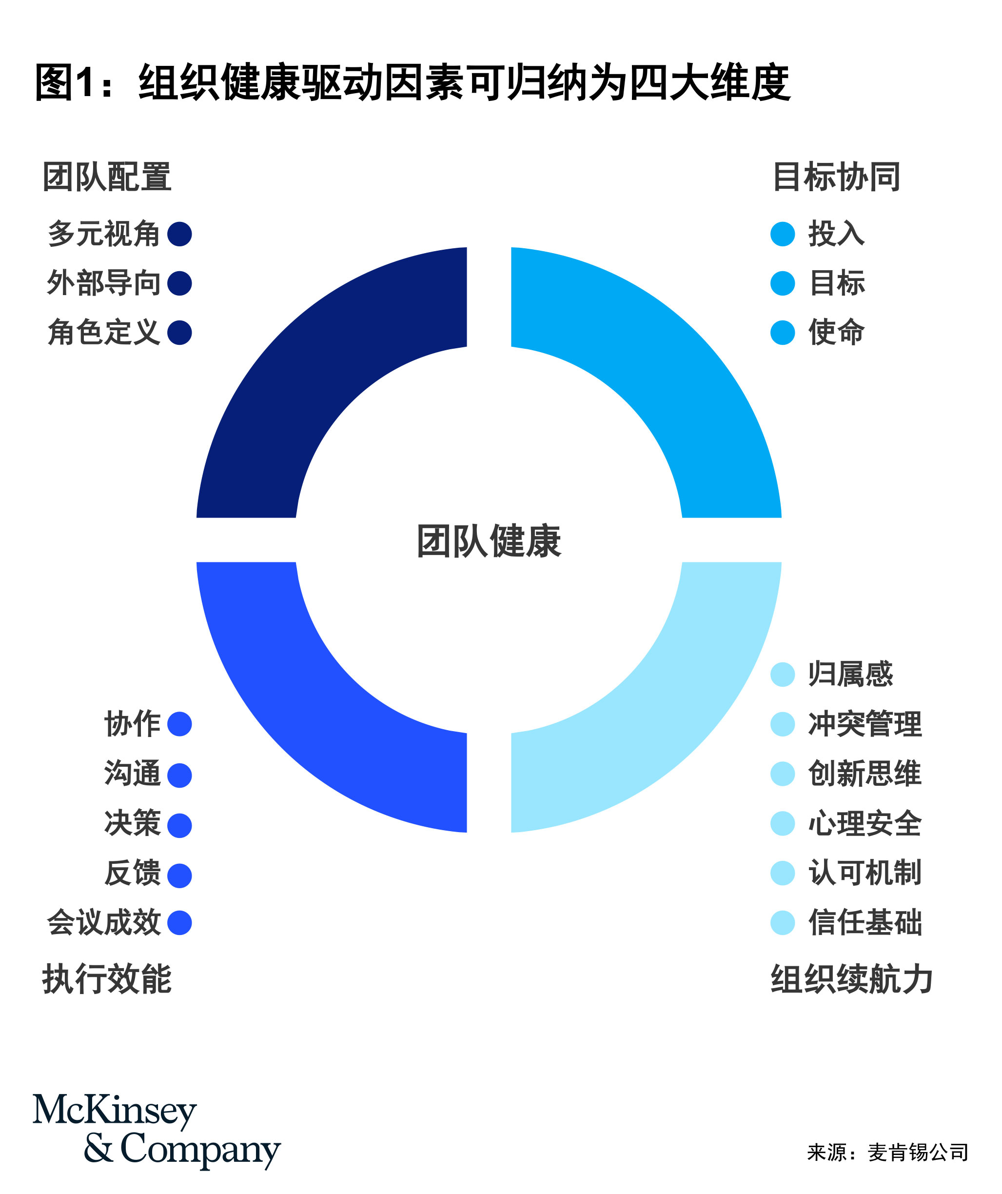 这些驱动因素可归纳为四大维度(图1):团队配置:权责边界清晰,成员视角多元;目标协同:团队方向明确,成员全情投入;执行效能:落地推进能力强;组织续航力:互动氛围积极正向,具备长期发展动能。通过对这四个维度的健康度分析,CEO可以全面客观地把握顶层团队的真实效能。