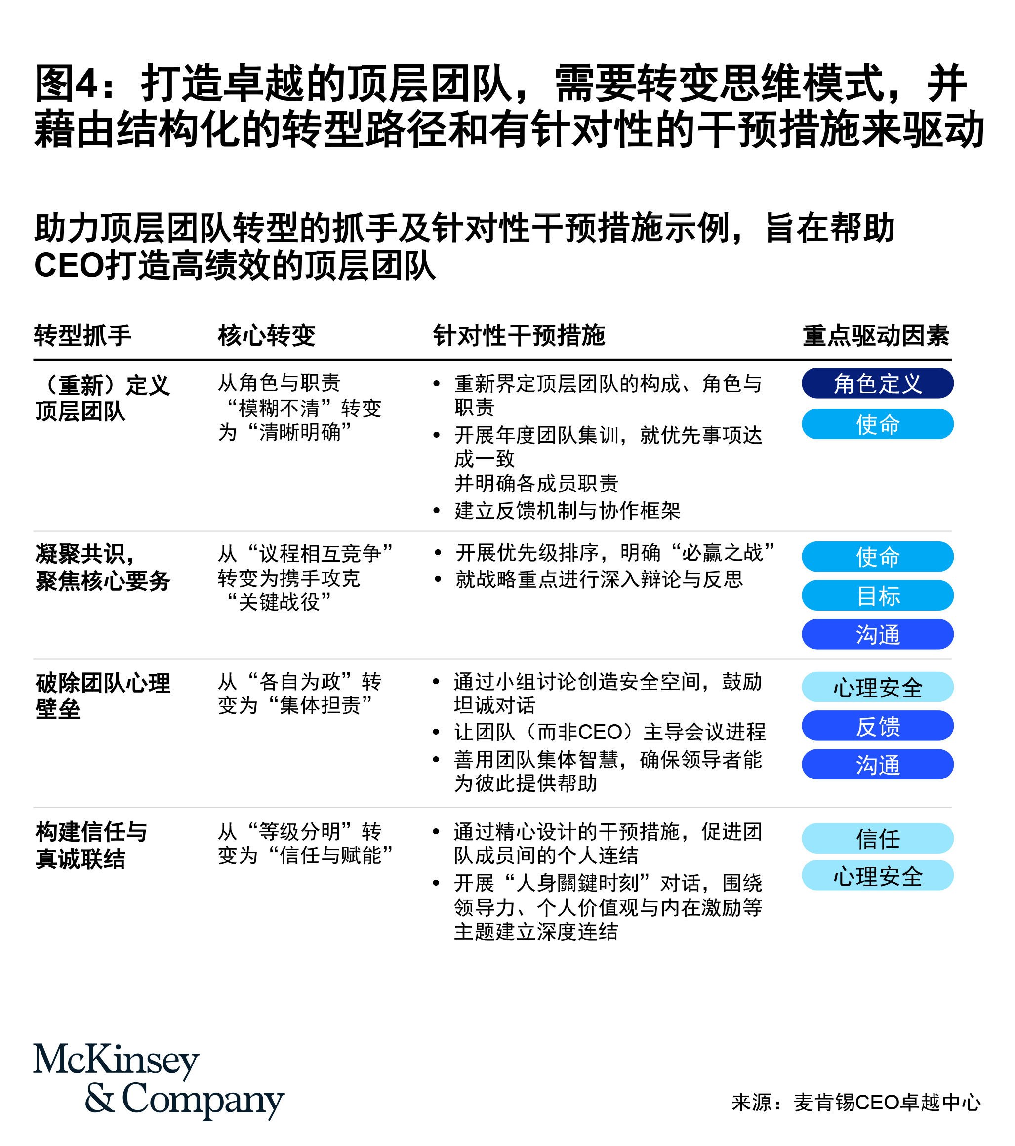 当CEO洞悉团队的真实状态后,接下来的关键步骤便是亲自下场,与团队一道踏上变革之旅。本节将通过一组真实案例,展现顶层团队如何通过针对性变革实现蜕变(图4)。这些案例均聚焦于前文所述的、最能撬动高层团队绩效的核心行为与特质。