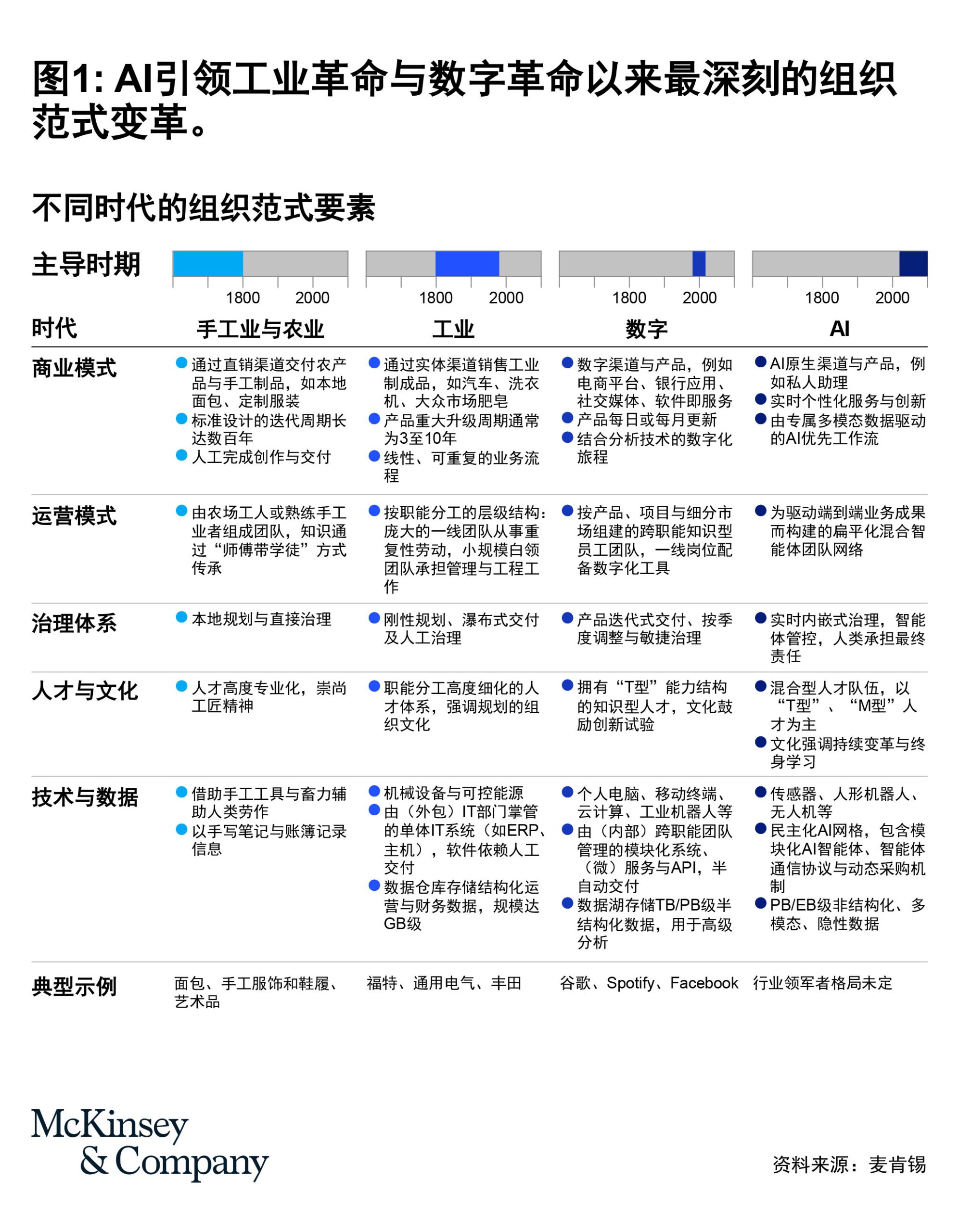 AI正引发继工业革命与数字革命之后对组织形态影响最为深远的组织变革(详见边栏“运营模式的演进”)。这一新范式让人类与AI智能体(不论虚拟或实体形态)以空前规模协作,而边际成本趋近于零。我们将这种新型组织形态称为“智能体型组织”。